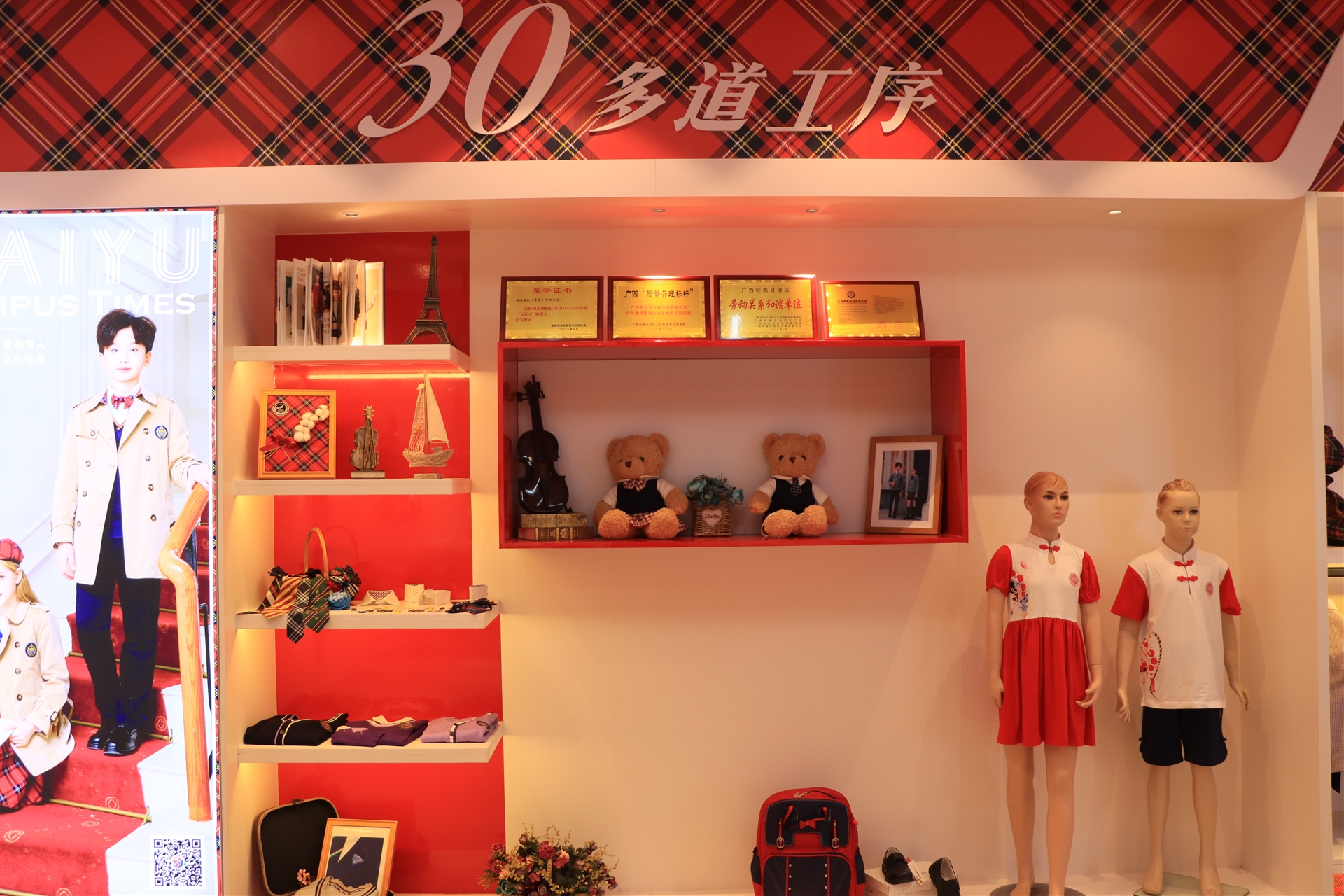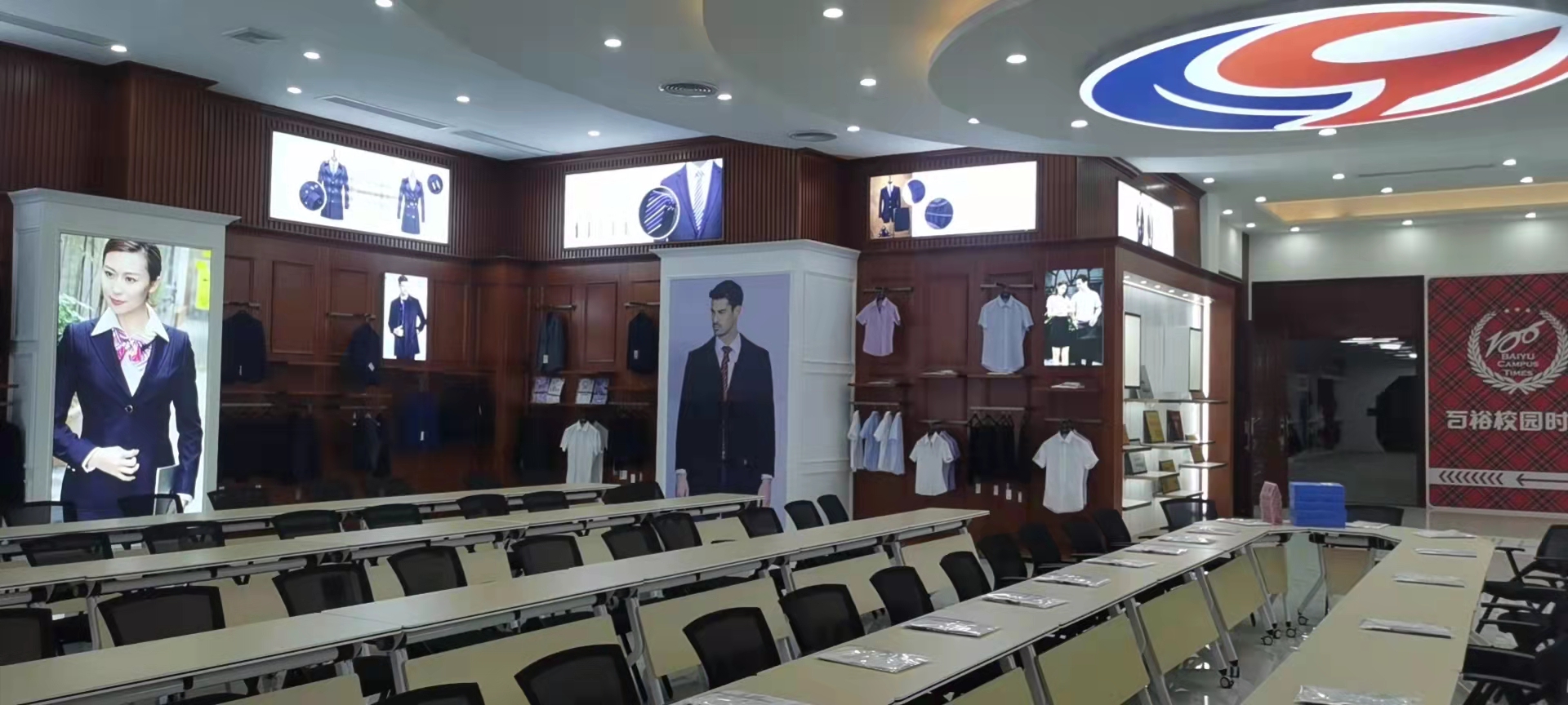 品牌館展示了百裕集團旗下百裕校園時代、喬派恩、愛樂學(xué)等品牌服飾經(jīng)典款,不同的區(qū)域裝飾風(fēng)格展現(xiàn)不同的品牌個性與文化,可滿足靜態(tài)與動態(tài)不同形式的展示方式。