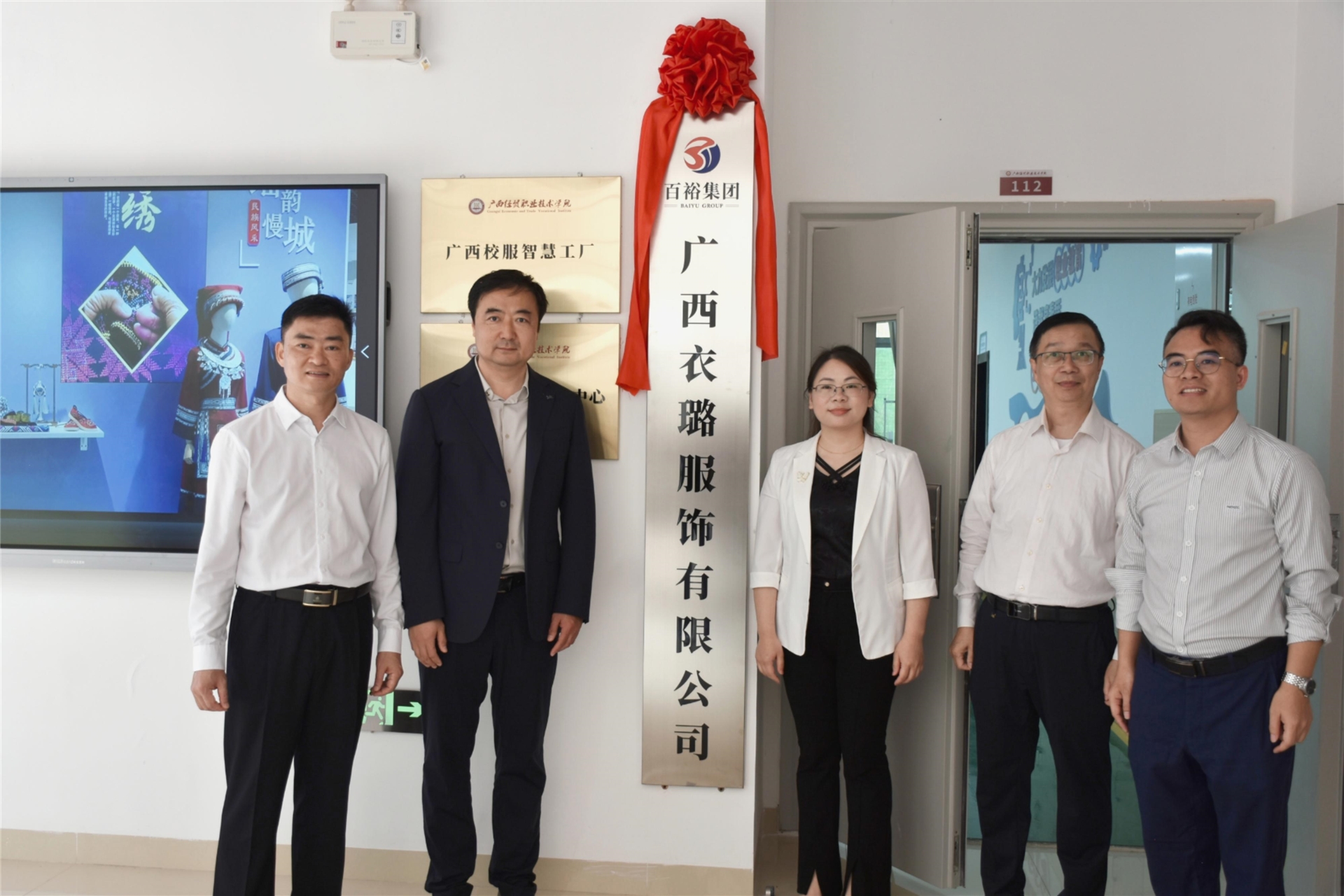 中國紡織服裝教育學會會長紀曉峰、廣西經貿職業(yè)技術學院校長羅生芳、副校長林震、藝術設計與建筑學院副院長蔣衛(wèi)軍與百裕集團市場總監(jiān)曾凱蘭共同為產業(yè)學院揭牌,現(xiàn)場掌聲雷動,標志著雙方在產教融合領域邁出了具有里程碑意義的一步。