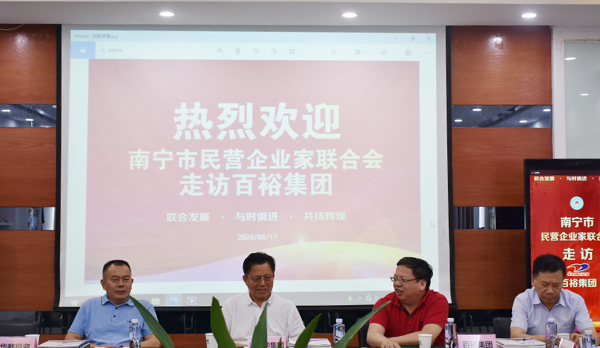 南寧市民營企業(yè)家聯(lián)合會始建于1992年4月,是南寧市成立最早的商會之一。會員行業(yè)涵蓋房地產(chǎn)開發(fā)、融資擔(dān)保、建材、制造、礦業(yè)、餐飲、農(nóng)業(yè)、五金機(jī)電、商貿(mào)物流等多個行業(yè),市場已拓展到美國、加拿大、日本、韓國、東盟各國等地。百裕集團(tuán)董事長許曲煌做為聯(lián)合會執(zhí)行會長,認(rèn)真履行會員企業(yè)的義務(wù)和工作,積極與企業(yè)會員企業(yè)交流學(xué)習(xí)。此次走訪活動中,各企業(yè)家參觀了百裕集團(tuán)產(chǎn)品展示廳、觀看了集團(tuán)各分公司、生產(chǎn)中心、研發(fā)中心等相關(guān)視頻短片,并在會議室進(jìn)行了交流會議。