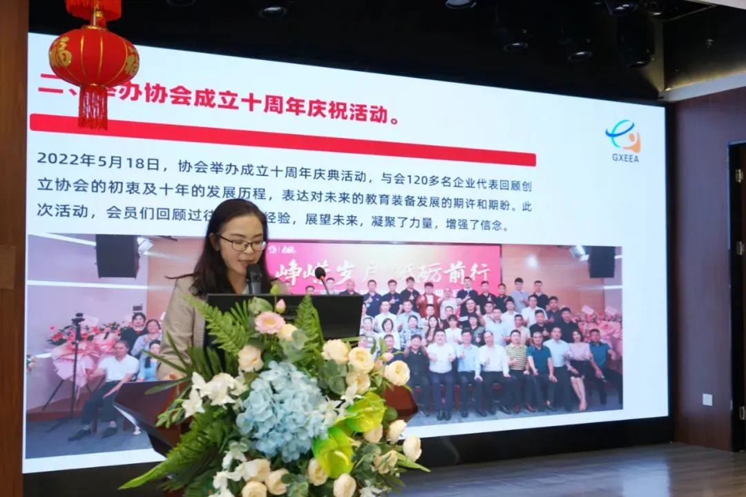 張珊會長對協(xié)會2022年工作情況進(jìn)行了總結(jié)匯報。2022年協(xié)會密切關(guān)注國家大事,堅定不移與黨中央保持高度一致,組織協(xié)會會員企業(yè)集中學(xué)習(xí)黨的二十會議精神。在新冠疫情的大環(huán)境下,舉辦協(xié)會成立十周年慶典活動,成功舉辦第11屆廣西教育裝備展示會,成立協(xié)會專家組,與廣西標(biāo)準(zhǔn)化協(xié)會簽訂發(fā)展戰(zhàn)略合作協(xié)議,同時積極吸收優(yōu)質(zhì)會員企業(yè),開展各種研討培訓(xùn)、展示交流、參觀考察、公益捐贈等活動,在會員的共同努力下,向行業(yè)向企業(yè)交出了一份滿意的答卷。