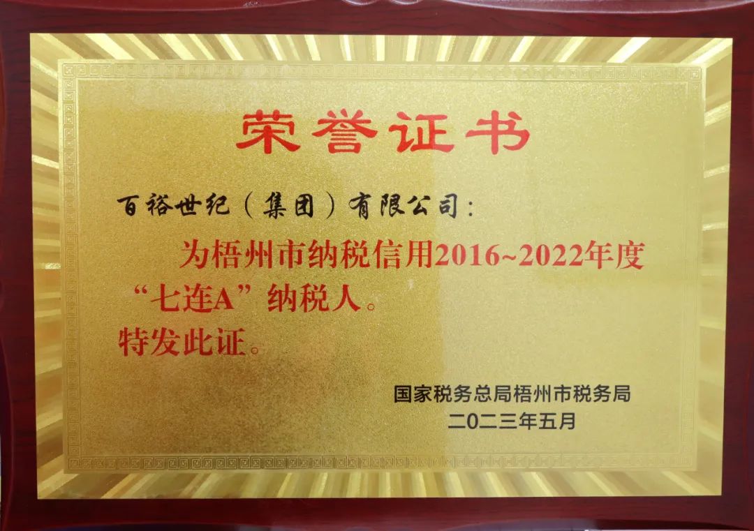 近日,經(jīng)國家稅務(wù)總局梧州市稅務(wù)局評審,百裕世紀(jì)(集團)有限公司被評為2016~2022年度“七連A”納稅人,這是我們堅持依法、誠信經(jīng)營的實質(zhì)成果。