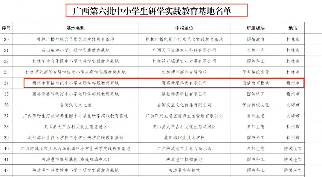 喜報丨百裕世紀(jì)(集團)入選廣西第六批中小學(xué)生研學(xué)實踐教育基地名單