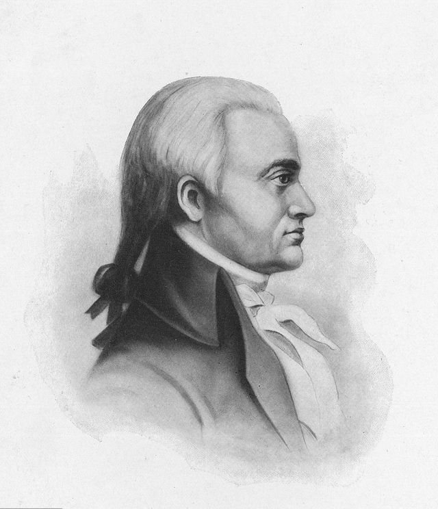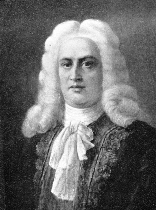 插畫,德國作曲家喬治·弗里德里希·亨德爾(1685-1759)。這個(gè)時(shí)期領(lǐng)帶的樣式在法朗士小說《領(lǐng)帶》中可見 :" 他的暗綠色上裝的領(lǐng)子豎得很高,他穿著一件南京紫花布背心,黑綢子寬領(lǐng)帶在他的頸子上繞了三圈。"
