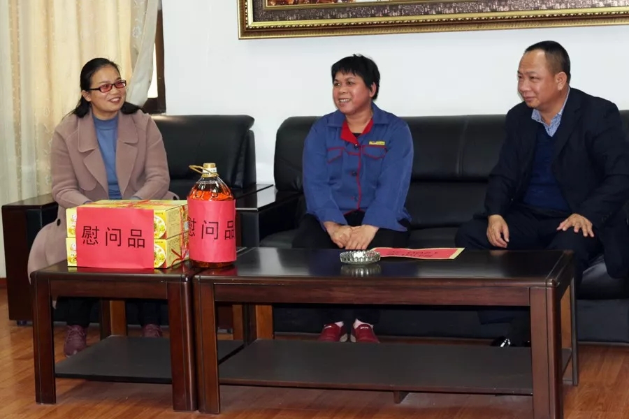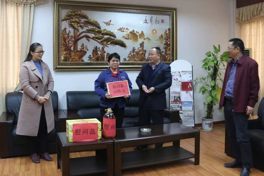 企業(yè)的發(fā)展離不開基層職工的辛勤付出,同月29日,廣西梧州市百裕實(shí)業(yè)有限公司常務(wù)副總經(jīng)理謝移植、岑溪生產(chǎn)廠廠長王平志一行先后走訪黃旭群等困難職工,為職工們送去春節(jié)禮品,并轉(zhuǎn)達(dá)了公司對職工的深切問候和美好祝福。