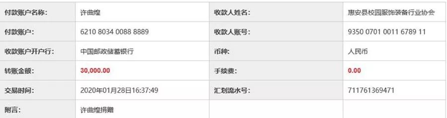 許曲煌董事長作為惠安校園服飾裝備行業(yè)協(xié)會會長,牽頭組織惠安校服協(xié)會共有132名會員企業(yè)家、群友,通過協(xié)會賬戶主渠道捐資520500元,通過其他渠道捐款的數(shù)額也將近20萬元。協(xié)會所募抗疫捐資,已轉(zhuǎn)40萬元到惠安縣慈善總會戶頭。其余的,根據(jù)有關(guān)部門意見,留待購買應(yīng)急防控醫(yī)用物品,或隨時聽候縣防控指揮部調(diào)用。目前,后續(xù)的捐款還在進行中。