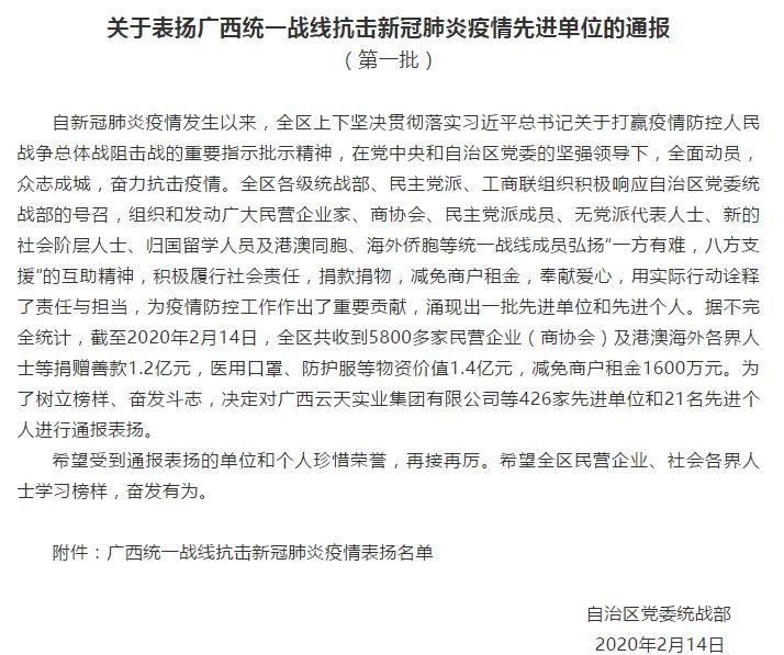 2月14日,自治區(qū)黨委統(tǒng)戰(zhàn)部表揚447個抗疫先進單位(個人),百裕集團在這次新冠肺炎病毒疫情愛心公益行動中,積極擔(dān)當(dāng)作為,認真履行企業(yè)應(yīng)盡的社會責(zé)任,捐款、捐物等公益表現(xiàn)得到了自治區(qū)統(tǒng)戰(zhàn)部的表揚,我們將珍惜榮譽,再接再厲,為打贏防控狙擊戰(zhàn)做出貢獻。