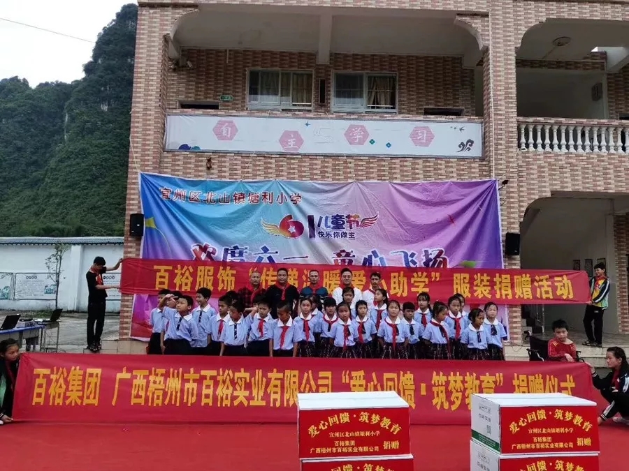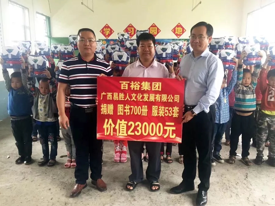 百裕集團(tuán)服務(wù)河池地區(qū)已有6年多,多年來(lái)開展了一系列的捐贈(zèng)助學(xué)的公益活動(dòng)。時(shí)值六一兒童節(jié),百裕集團(tuán)不忘初心,兌現(xiàn)“為環(huán)江村屯學(xué)校捐贈(zèng)1106套愛心校服”承諾,并增加圖書等物資捐贈(zèng),在總經(jīng)理林志煌的帶領(lǐng)下,先后走進(jìn)環(huán)江縣10個(gè)鄉(xiāng)14個(gè)村級(jí)小學(xué),惠及1106名小朋友,為孩子們送上節(jié)日的祝福。